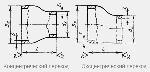 В вертикальных сетях используют концентрические переходы, центр диаметров отверстий которых находятся на одной оси. В горизонтальных плоскостях— эксцентрические с центрами на параллельных осях.