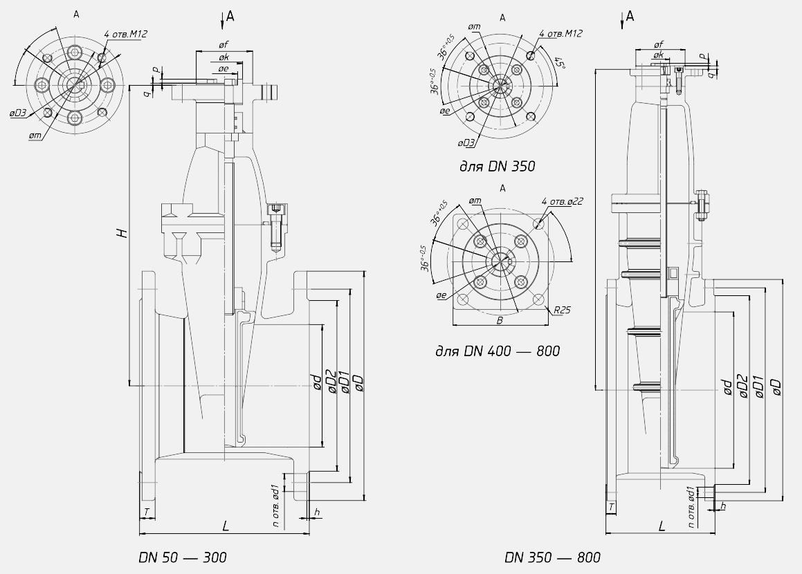 Габаритные размеры для задвижек 30ч939р PN 1,0 МПа